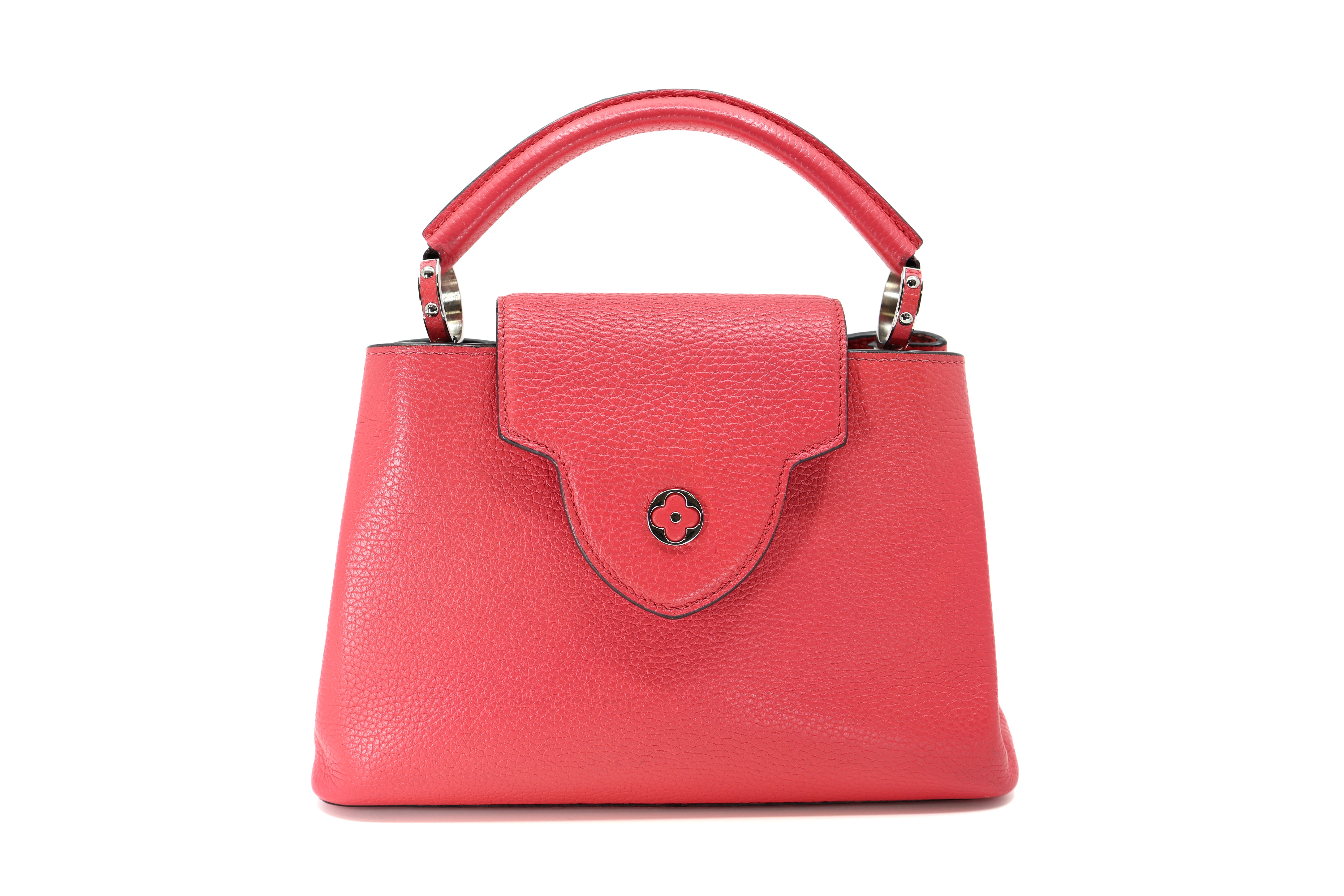 This is an authentic pre-loved Louis Vuitton Capucines BB Red in Taurillon Leather. Crafted from red taurillon leather, this handbag features a top handle with silver ring links and an adjustable shoulder strap. The flap opens to a partitioned interior with a zipper pocket.